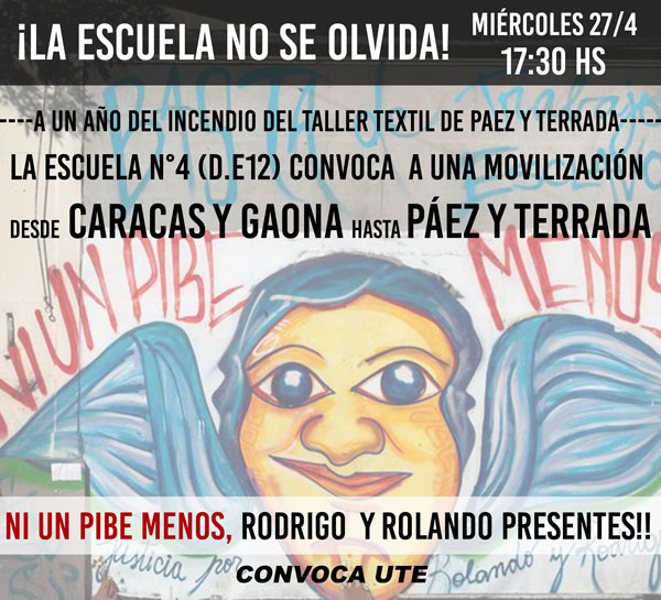 Portada del sitio > La Central Rodrigo y Rolando Presentes A un año del incendio del taller textil de Páez y Terrada Jueves 28 de abril de 2016, por Prensa UTE La Escuela Nº 4 (D. E. 12) convocó a una movilización a un año del incendio del taller textil de Páez y Terrada, desde Caracas y Gaona hasta Páez y Terrada. Ni un pibe menos, Rodrigo y Rolando Presentes!! Selecionar Mes articulos mensuales... mayo de 2024marzo de 2024diciembre de 2022noviembre de 2022octubre de 2022septiembre de 2022agosto de 2022julio de 2022junio de 2022mayo de 2022abril de 2022marzo de 2022febrero de 2022enero de 2022diciembre de 2021noviembre de 2021octubre de 2021septiembre de 2021agosto de 2021julio de 2021junio de 2021mayo de 2021abril de 2021marzo de 2021febrero de 2021enero de 2021diciembre de 2020noviembre de 2020octubre de 2020septiembre de 2020agosto de 2020julio de 2020junio de 2020mayo de 2020abril de 2020marzo de 2020febrero de 2020enero de 2020diciembre de 2019noviembre de 2019octubre de 2019septiembre de 2019agosto de 2019julio de 2019junio de 2019mayo de 2019abril de 2019marzo de 2019febrero de 2019enero de 2019diciembre de 2018noviembre de 2018octubre de 2018septiembre de 2018agosto de 2018julio de 2018junio de 2018mayo de 2018abril de 2018marzo de 2018febrero de 2018enero de 2018diciembre de 2017noviembre de 2017octubre de 2017septiembre de 2017agosto de 2017julio de 2017junio de 2017mayo de 2017abril de 2017marzo de 2017febrero de 2017enero de 2017diciembre de 2016noviembre de 2016octubre de 2016septiembre de 2016agosto de 2016julio de 2016junio de 2016mayo de 2016abril de 2016marzo de 2016febrero de 2016enero de 2016diciembre de 2015noviembre de 2015octubre de 2015septiembre de 2015agosto de 2015julio de 2015junio de 2015mayo de 2015abril de 2015marzo de 2015febrero de 2015enero de 2015diciembre de 2014noviembre de 2014octubre de 2014septiembre de 2014agosto de 2014julio de 2014junio de 2014mayo de 2014abril de 2014marzo de 2014febrero de 2014enero de 2014diciembre de 2013noviembre de 2013octubre de 2013septiembre de 2013agosto de 2013julio de 2013junio de 2013mayo de 2013abril de 2013marzo de 2013febrero de 2013enero de 2013diciembre de 2012noviembre de 2012octubre de 2012septiembre de 2012agosto de 2012julio de 2012junio de 2012mayo de 2012abril de 2012marzo de 2012febrero de 2012enero de 2012diciembre de 2011noviembre de 2011octubre de 2011septiembre de 2011agosto de 2011julio de 2011junio de 2011mayo de 2011
