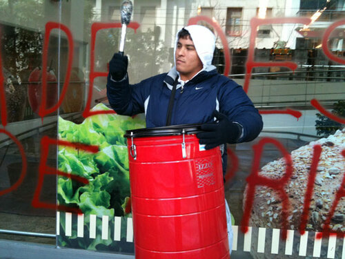 En rechazo a la postura de la empresa de acceder a despedir a los opositores señalados por delegados que responden al secretario general Armando Cavalieri, el viernes 8 de julio, en sintonía con la huelga de hambre que por idénticos motivos llevaron a cabo los trabajadores de la cadena de supermercados Coto, un grupo de delegados históricamente enfrentados a Cavalieri, realizaron un escrache en la sucursal de Avenida Rivadavia y José María Moreno en el Barrio Porteña de Caballito de la Capital Federal.