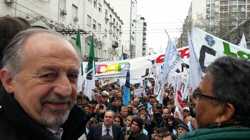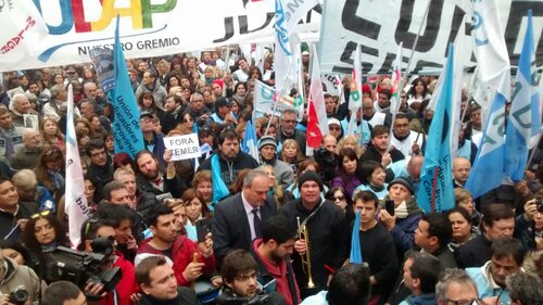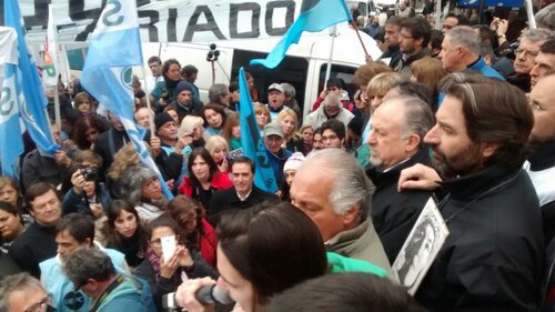 Mañana en todo el país hay un paro nacional de los docentes. Los compañeros de la Ctera, los compañeros de la UEPC, Córdoba, los de Sadop, los de UDA, están marcando el camino que hay que seguir, hay que pedir la reapertura de las paritarias.. Basta de la mentira de la pobreza cero. No hay pobreza cero. Hay cada día más pobres, cada día más hambre, hay cada día más trabajadores que pierden su empleo. La lucha de los docentes marca el camino para el conjunto. Por eso, en esta Marcha Federal, juntas las dos CTA, la CGT, los trabajadores de los movimientos sociales, los jubilados, los de las Pymes, juntos tenemos que construir ese gran paro nacional, que tiene que ser la línea de partida para que nuestro pueblo termine con el ajuste