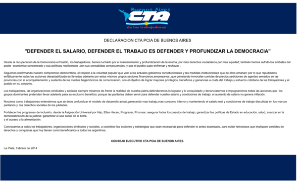 “Seguimos reafirmando nuestro compromiso democrático, el respeto a la voluntad popular que voto a los actuales gobiernos constitucionales y las medidas institucionales que de ellos emanan; por lo que repudiamos enfáticamente todas las acciones desestabilizadoras llevadas adelante por estos mismos grupos,sectores financieros,empresarios, que generando inmorales corridas de precios, sediciones de agentes armados en las provincias,con el acompañamiento y sustento de los medios hegemónicos de comunicación, con el objetivo de lograr mayores privilegios, beneficios y ganancias a costa del trabajo y esfuerzo cotidiano de los trabajadores y el pueblo en su conjunto.