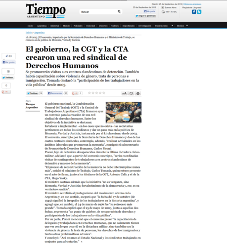 El gobierno nacional, la Confederación General del Trabajo (CGT) y la Central de Trabajadores Argentinos (CTA) firmaron ayer un convenio para la creación de una red sindical de derechos humanos. Entre los objetivos de la iniciativa se destacan: fortalecer e implementar –en los casos que no exista– las secretarias pertinentes en todos los sindicatos y dar un paso más en la política de Memoria, Verdad y Justicia, instaurada por el kirchnerismo desde 2003.