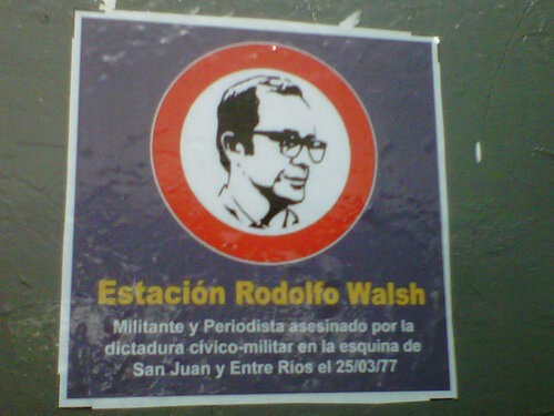 Alicia apoyó el libro sobre su morral y levantó la vista, ese chequeo automático cuando el tren para, mirar rápido a ver si es su parada, si ya se pasó o si todavía falta. “Estación Rodolfo Walsh (ex Entre Ríos)”, leyó en el cartel. Los pocos segundos de detención fueron suficientes para estirar la mano y tomar un volante que le entregaron desde el andén. Y así fue testigo de la intervención visual de esa estación de la línea E, que ayer a mediodía le cambió el nombre en un operativo de homenaje al Día del Periodista, ideado y concretado por el Sindicato del Subte, la Asociación Gremial de Trabajadores del Subte y Premetro, el Grupo de Arte Callejero (GAC) e HIJOS Capital.