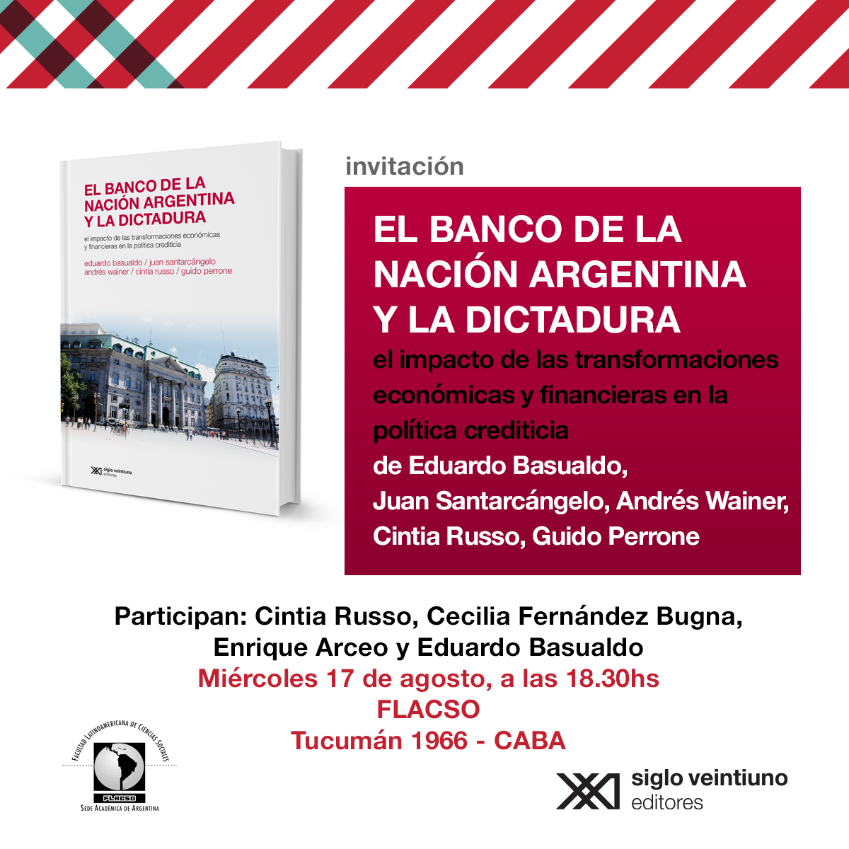 El miércoles 17 de agosto se presentará el libro "El Banco de la Nación Argentina y la dictadura. El impacto de las transformaciones económicas y financieras en la política crediticia", de los autores Eduardo Basualdo, Juan Santarcángelo, Andrés Wainer, Cintia Russo y Guido Perrone, a las 18:30 en la Facultad Latinoamericana de Ciencias Sociales (FLACSO), Tucumán 1966, C.A.B.A.
