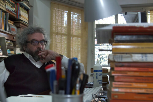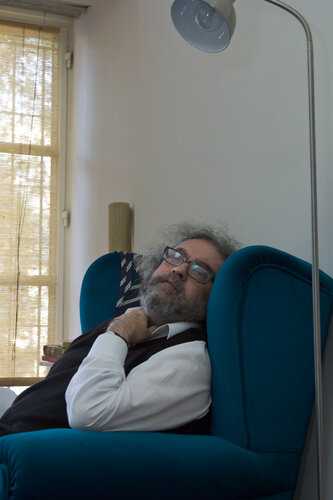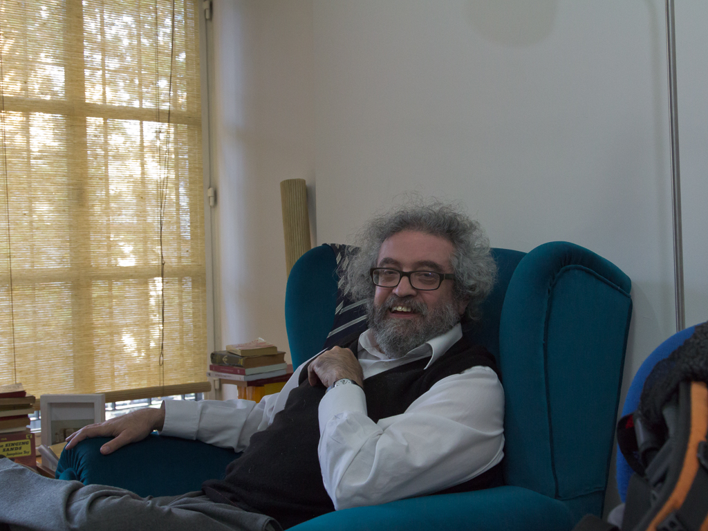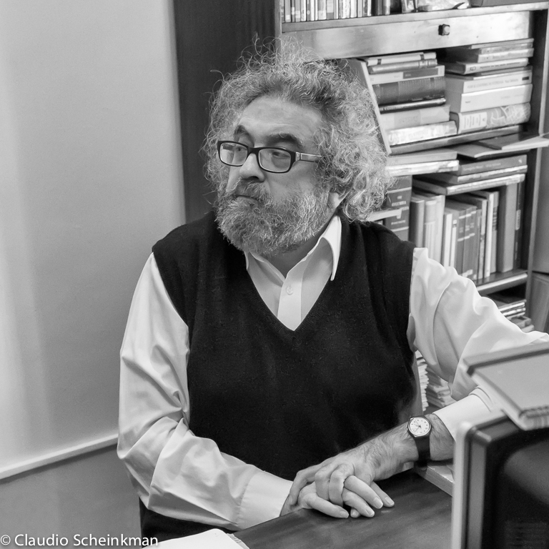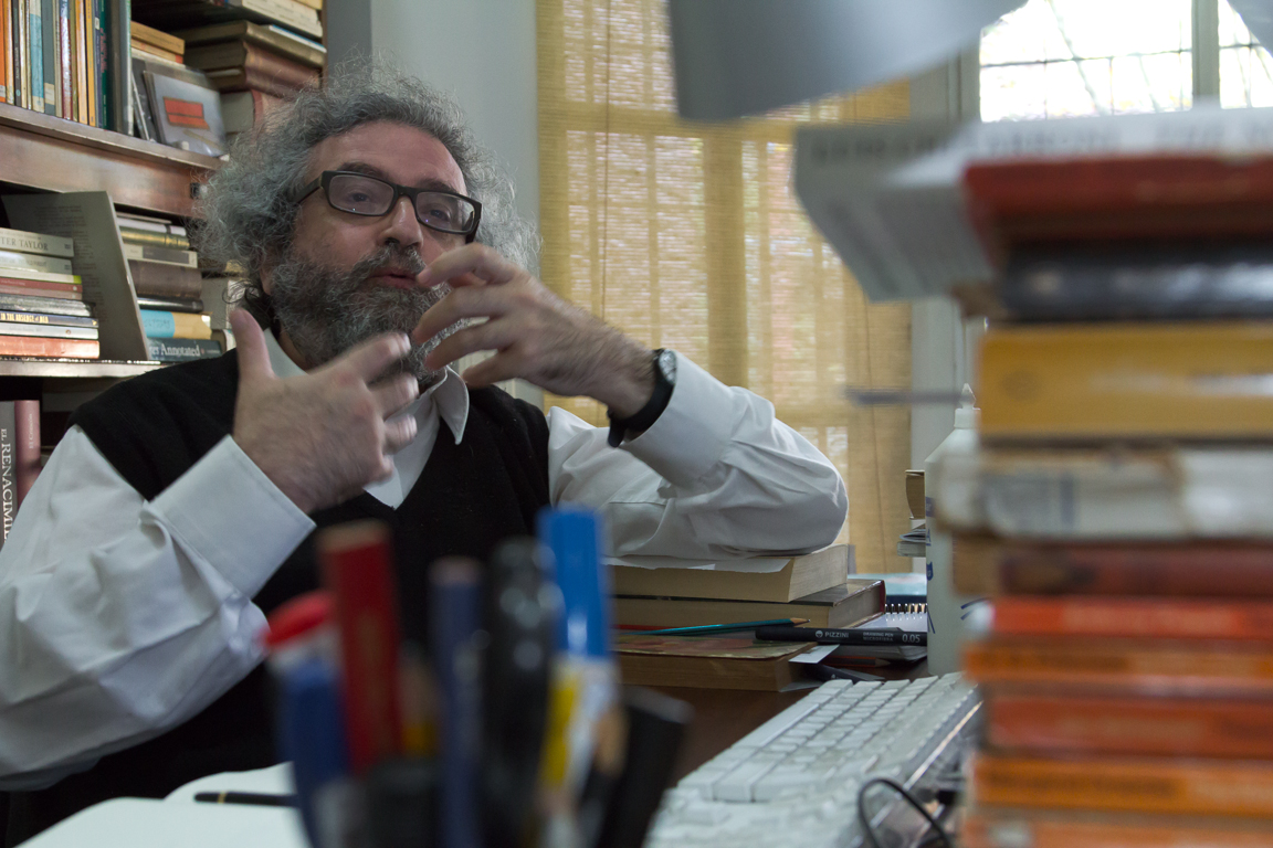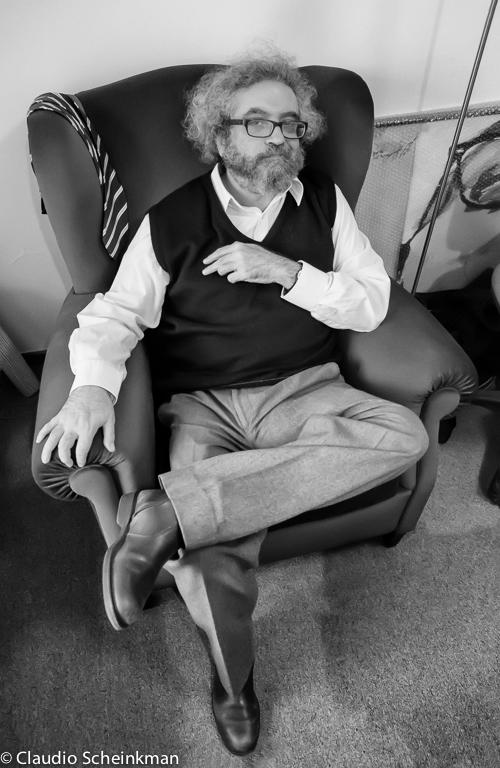 La entrada del bunker Chitarroni, en el barrio de Belgrano, es cálido y los libros amarran la geografía de un mundo propio. En la sala misma de la planta baja hay una mesa ratona con ediciones gordas de pinturas y cómics. El tiene su estudio en el primer piso y en su escritorio ocupa un lugar central un pote grande plasticola, (me muero de ganas de preguntar qué hace un artilugio del siglo pasado, allí) En varios pasajes de la charla, Chitarroni cierra sus manos sobre el pote y reflexiona apoyándose en esa extraña mascota. A un costado un sol de la tarde insiste en participar de la charla y “quema”, incendia vidrios y ventana, pero sigue allí, frío y empecinado.