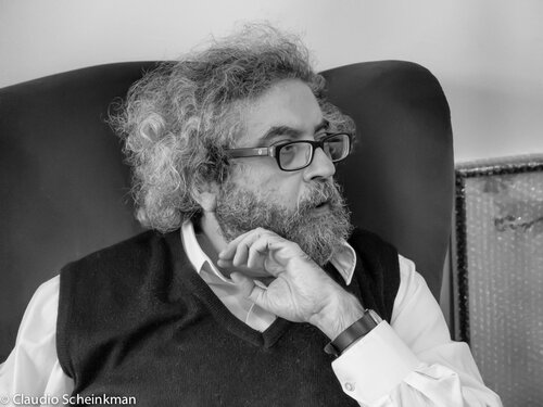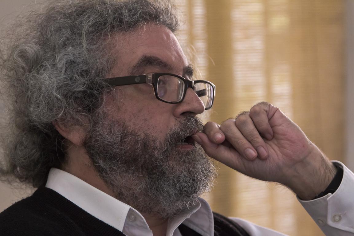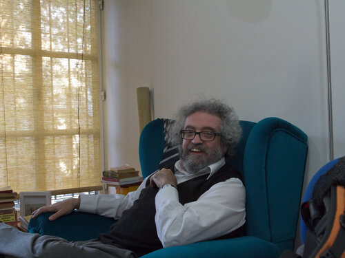 En un momento mira la cámara y se maravilla de la cámara. Dice, es un objeto bello. Pregunta, como dudando, - es bella no? A renglón seguido cuenta que su hijo se ha comprado y, resignado afirma, - naturalmente, la pagué yo. Luego habla de Dolina, de Fontarrosa, cuenta que el célebre Negro rosarino en una oportunidad le canceló un encuentro porque jugaba el cuadro de sus amores y por supuesto no estaba dispuesto a perdérselo. Se ríe evocándolo. Y por último, cuenta en off, que el nombre de la Bestia Equilátera se le ocurrió a propósito de un cuento de un alumno de taller que anunciaba la Bestia pero ésta nunca aparecía. Una suerte de Godot bestial, pensamos y atrapamos ese nombre para nuestra editorial. Somos un poco así, bestiales.