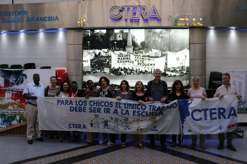 El lunes 13 de noviembre se realizó una reunión preparatoria hacia la IV Conferencia Mundial sobre la erradicación sostenida del Trabajo Infantil. A la reunión, que fue previa al encuentro, asistieron representantes de la IE, de la Marcha Global y de la CTERA. Por la Confederación de Trabajadores de la Educación, en cuya sede se realizó el evento, estuvo el secretario gremial de CTERA, Eduardo López; la secretaria de Salud Laboral, Noemí Tejeda; la coordinadora del área trabajo infantil,Viviana Doval, como así también Marisol Marchionati y Griselda Cima, integrantes del Equipo de Trabajo Infantil de la CTA-T. También, el director de Relaciones Internacionales de la Central, Andrés Larisgoitia.