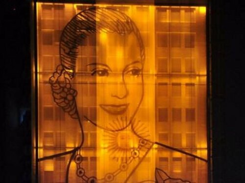 La presidenta Cristina Fernández encabezó la inauguración de la obra realizada en hierro con la imagen de Evita que se colocó sobre la fachada sur del Ministerio de Desarrollo Social, ex Ministerio de Obras Públicas, donde 22 de agosto de 1951 la abanderada de los humildes renunció a la candidatura a vicepresidenta de la Nación.