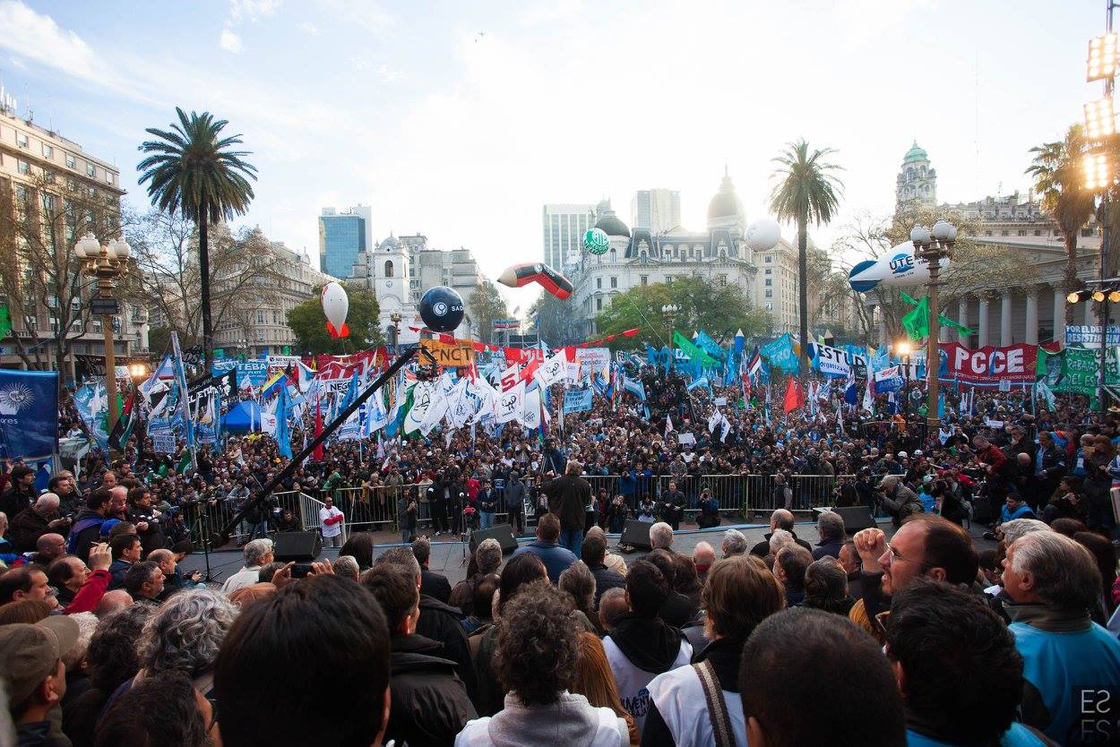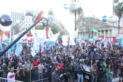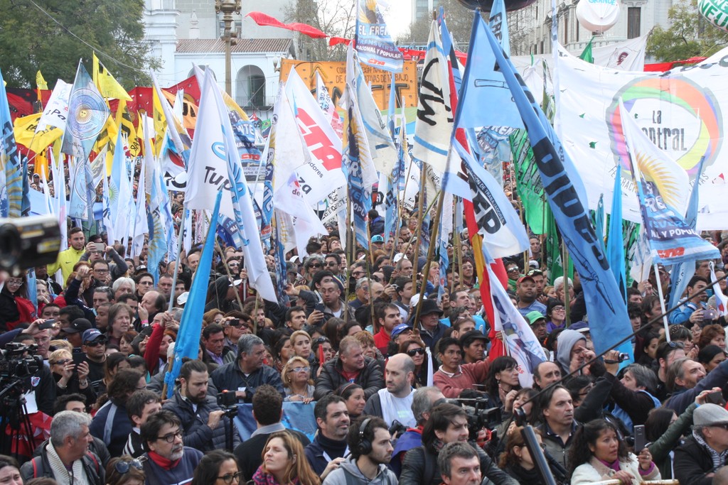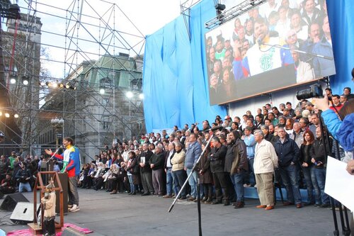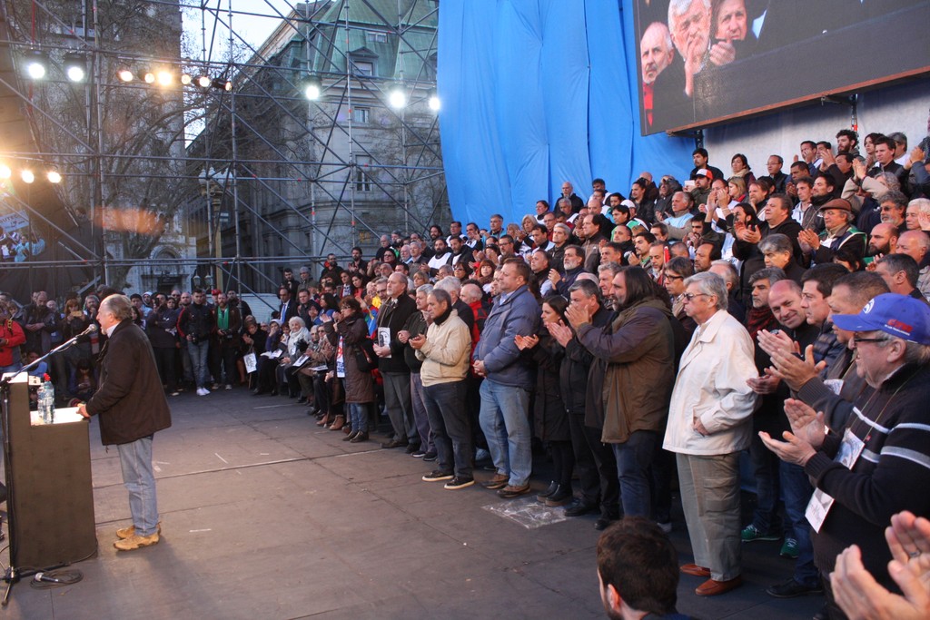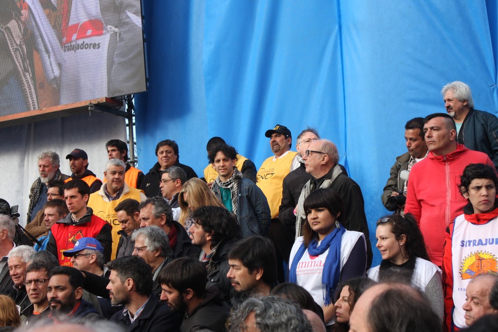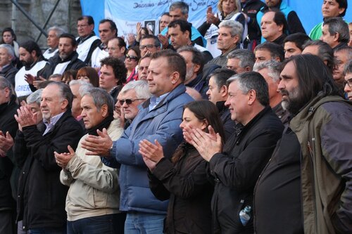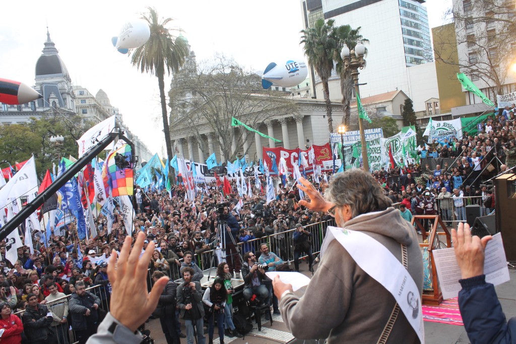 "Unidad de los trabajadores. La unidad también, que marca un momento nuevo, distinto, en la confluencia del movimiento sindical y de los movimientos sociales; la unidad en la convergencia con el movimiento estudiantil, con los organismos de Derechos Humanos, con los pequeños productores de las Apymes (Asambleas de Pequeños y Medianos Empresarios), que han estado con nosotros, los pequeños productores del agro y la agricultura familiar; la unidad con los trabajadores informales, la CNCT (Confederación Nacional de Cooperativas de Trabajo), las empresas recuperadas, la CTEP (Confederación de Trabajadores de la Economía Popular), la FTV (Federación Tierra, Vivienda y Hábitat), el Frente Transversal, muchas más. Unidad con las organizaciones de izquierda; unidad con las organizaciones que representan al sector agrario; con los cooperativizados. Esa unidad es el mapa del campo popular, que el liberalismo y el neoliberalismo quiere dividido, quiere roto, quiere que cada pedacito no encastre con el otro. Si ellos nos logran dividir, van a lograr dominarnos. Si nosotros construimos la unidad con la convicción de que esa unidad es para la lucha, por la liberación, por la emancipación social, la justicia social, si esa Unidad la construimos somos invencibles. Y hoy, en esta marcha, en este día, yo lo decía cuando estuvimos en el Cerro de la Gloria, que a veces la historia nos pone en el día, en el lugar, en la hora y el momento en que casi sin darnos cuenta, sin ser conscientes, la historia nos pone en un punto en el que somos protagonistas de un cambio profundo, de una nueva historia y hay que ser conscientes de que hoy la historia nos dice: la Argentina va a cambiar porque este pueblo no se arrodilla ante el poder económico ni ante la represión".
