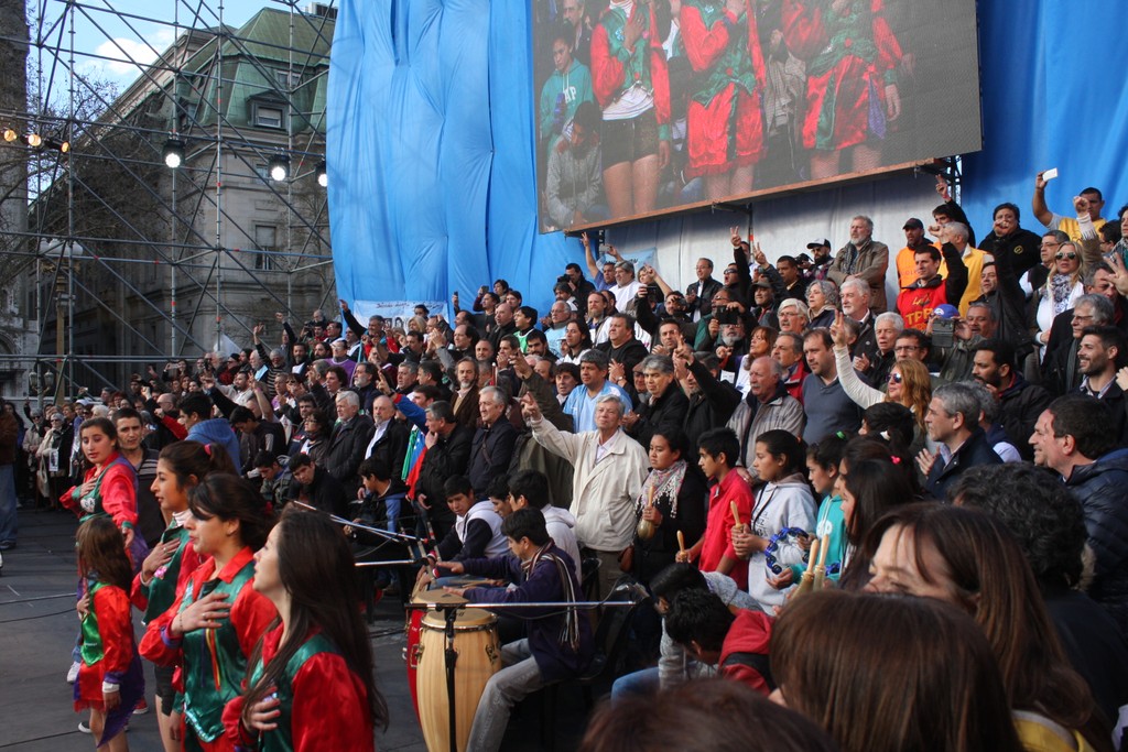 Para dar continuidad a la gran Marcha Federal, que comenzó el 31 de agosto, y continuó el 1 y 2 de septiembre, con actos en Rosario, Córdoba, La Matanza y Avellaneda, entre otras localidades del país, el multitudinario acto en Plaza de Mayo comenzó puntualmente a las 17:00 con una versión del Himno Nacional Argentino completo, interpretado por un ensamble de alumnos y alumnas integrantes de la Orquesta Latinoamericana del Colegio Secundario Tintina de Santiago del Estero. “Queremos expresar nuestro rechazo y repudio a las políticas que deterioran y degradan la educación pública”, señalaron las jóvenes del Centro de Estudiantes del colegio, en nombre de todas y todos los alumnos. “Y nos manifestamos en favor de una educación con inclusión y de calidad, con participación, con democracia, con igualdad de oportunidades para todos, para los que viven en la ciudad, en el campo, para los que vivimos monte adentro, en las montañas, en el monte, en el centro o en el sur de nuestra querida Argentina”.