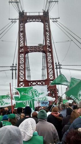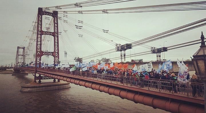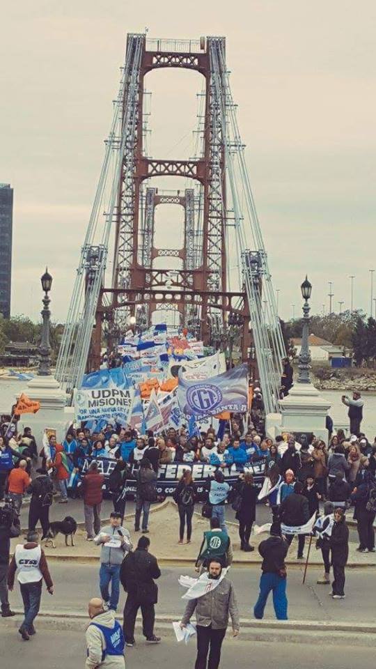 En una multitudinaria manifestación de trabajadores públicos y privados, organizaciones civiles, políticas, de derechos humanos, barriales, estudiantiles, se cruzó el Puente Colgante de la capital santafesina cubriéndolo de ciudadanos que expresaron su rechazo a las medidas neoliberales tomadas durante los últimos meses por el gobierno nacional.