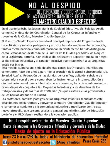 El gobierno porteño ha resuelto despedir al fundador y coordinador de las Orquestas Infantiles y Juveniles de la Ciudad, Maestro Claudio Espector, reconocido como "personalidad destacada de la Cultura de la Ciudad" por todos los bloques de la Legislatura porteña.