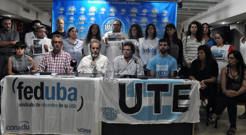 Participaron de la ronda de prensa el secretario general y el secretario adjunto de UTE Eduardo López y Guillermo Parodi respectivamente, el secretario general de FEDUBA Federico Montero, el presidente del Centro de Estudiantes de la Facultad de Ciencias Sociales de la UBA Pablo Móbili, por Científicos y Universitarios Autoconvocados Cinthia Wanschelbaum, Patricia Blanco, una madre de la escuela pública, y María Laura Romano del colectivo Becarios empoderados.