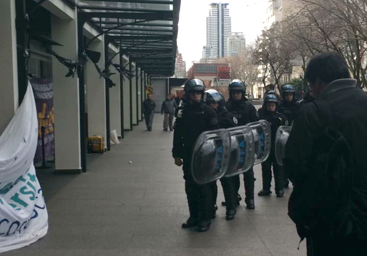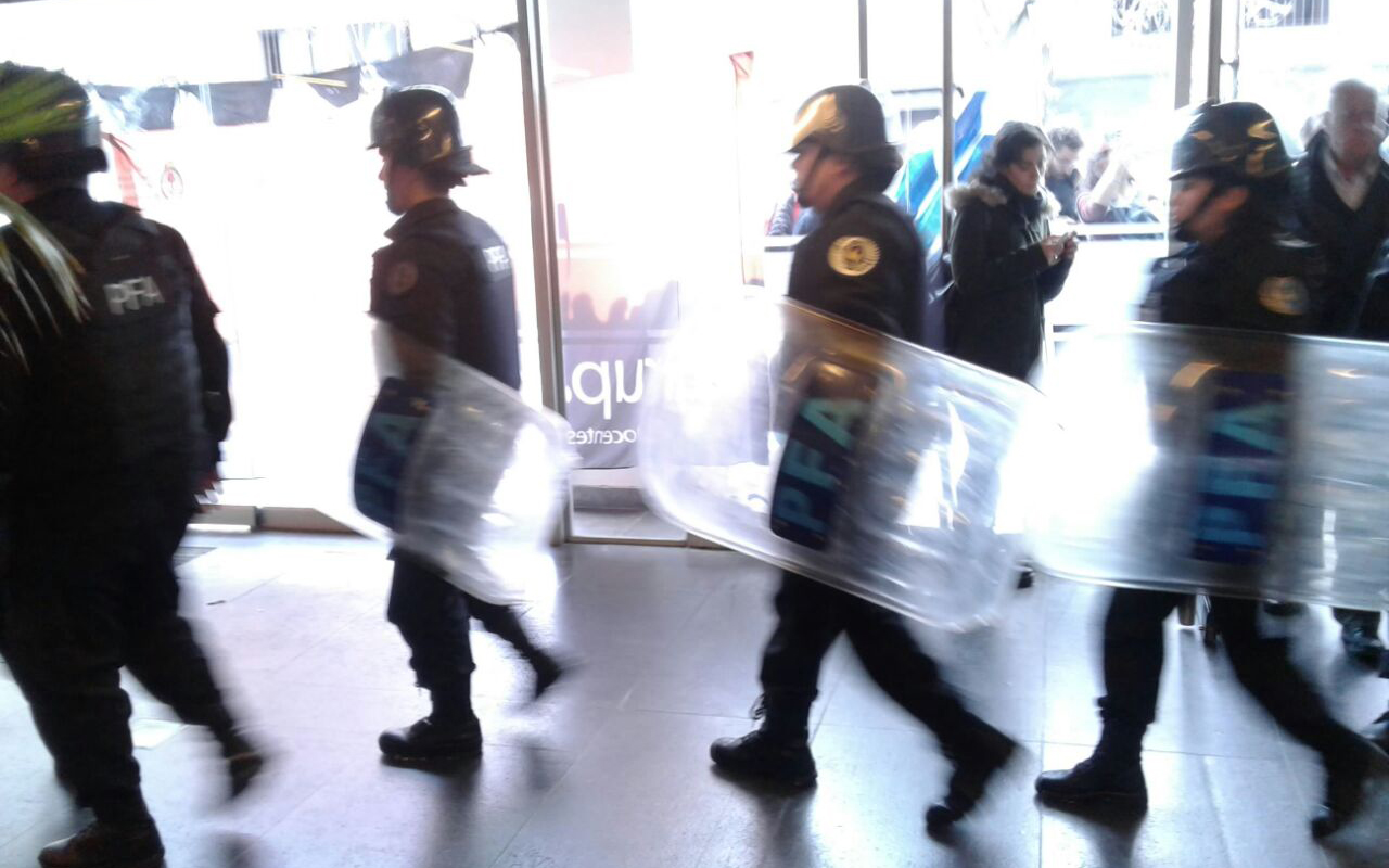 En momentos en que los trabajadores discutíamos en asamblea las condiciones en que se daría una reunión con el ministro, la policía desplegó una nutrida fuerza de choque, equipada con armas, palos, escudos y cascos que ingresó a las instalaciones arrinconando a las cientos de investigadores, becarios, técnicos y administrativos que nos encontrábamos en el interior del hall. Posteriormente, se reportaron casos de amedrentamiento a compañeras y compañeros que se acercaban al ministerio para solidarizarse por la lucha y contra la represión.