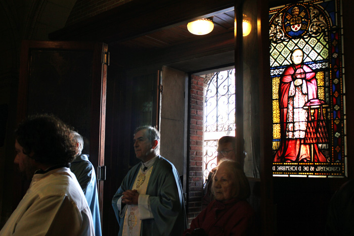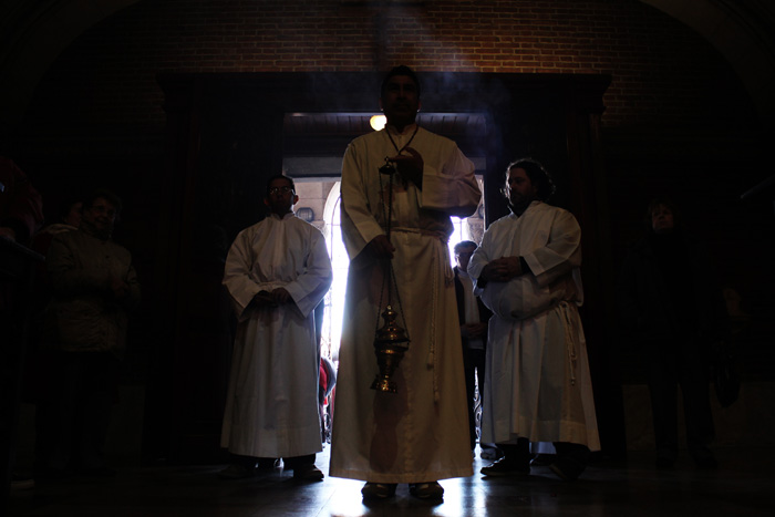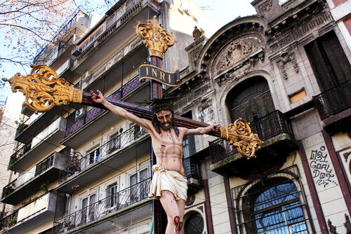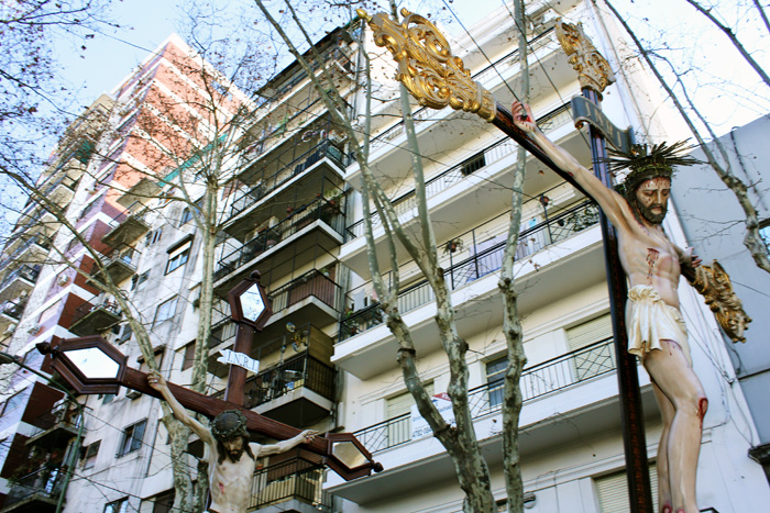 En el año 1948, trajeron el Cristo de Plata para acá a la Iglesia de Nuestra Señora del Tránsito. El primer Cristo histórico es el que está en la Iglesia de la Misericordia en Moreno y Solís. Este Cristo vino a nuestro país en 1870 con los Salecianos. Fueron los genoveses de Savonna quienes trajeron esta imagen juntamente con la Obra de Don Bosco. Este Cristo de Plata que tenemos aquí cuando vino de Italia tenía ciento veinticinco kilos. En ese momento, acá en el Abasto los genoveses trabajaban en el mercado. Eran hombres rudos, cargaban y descargaban camiones todos los días. Estos “tanos” venían trayendo esta devoción y pensaban cuanto más grande y pesado, mejor.