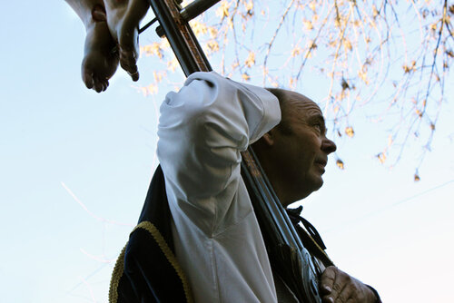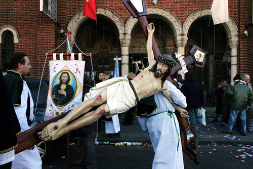 Sobre el contraste entre los orígenes y el presente de esta tradición, Rossi cuenta que “antiguamente marchaban como ahora, pero con la particularidad de que el Cristo iba al revés de la usanza litúrgica actual. O sea que el Cristo miraba hacia atrás, hacia la tropa infundiendo valor y dándole la espalda a los infieles. Desde entonces, en toda manifestación que se hace en la región Lígure de Italia nunca faltan estos Cristos. También en otro tiempo, los encargados de transportar estos Cristos llevaban una capucha blanca, cubiertos con una túnica del mismo color; como lo hacen todavía los “costaleros” en Sevilla. Según cuentan, lo hacían por que a los ojos de Dios somos todos iguales. El ku kux klan, y su historia hizo que se dejara de lado esta costumbre. Posteriormente, también se dejaron de usar los Cristos gigantes. Luego, el Papa Urbano II Bula Pontificia logró que en el Lígure salieran nuevamente a la calle. En la Liguria, en cada oratorio hay un Cristo. Los oratorios están al lado de cada iglesia y se construyeron también a raíz de estas peleas que sacaron a los Cristos de las iglesias. Entonces, los “tanos” construyeron sus propias iglesias que son estos oratorios”.