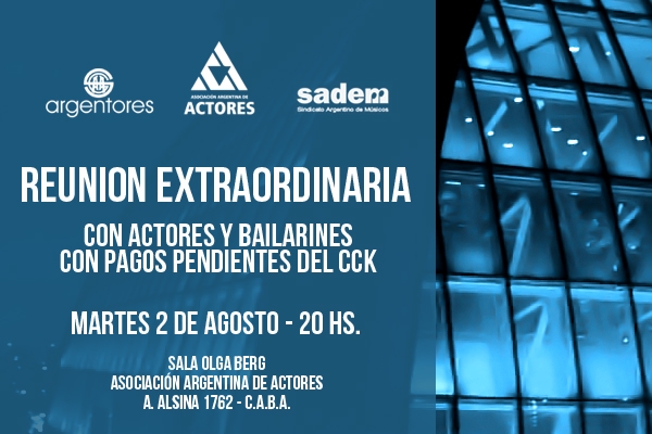 Recordamos que desde la Secretaría Gremial de la Asociación Argentina de Actores se ha remitido la documentación sobre la deuda a las autoridades del CCK y de la Universidad de San Martín (UNSAM) hace 2 meses. Hace quince días establecimos contacto con el Ministro Hernán Lombardi, titular del Sistema Federal de Medios y Contenidos Públicos, expresándole nuestro reclamo por la deuda. El Ministro se comprometió a coordinar una reunión con nosotros, la que sería comunicada a través de su secretaria.