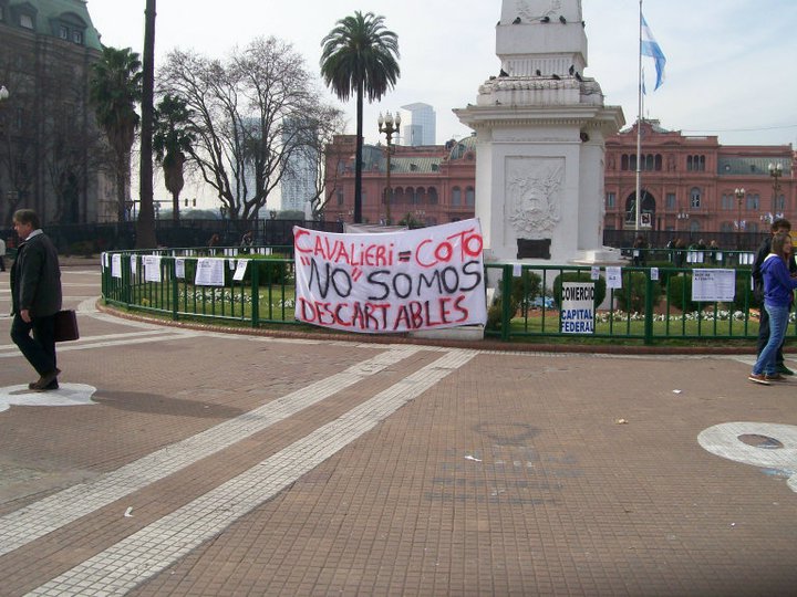 Bajo las consignas "Protestar no es un crimen" y "No somos descartables" Ricardo Ham, Alán Juárez y Juan José Martin hicieron pública la denuncia de complicidad del sindicato de empleados de comercio con los despidos contra los trabajadores que no votaron por Armando Cavalieri y del fallo que pena con un año y seis meses de prisión en suspenso al delegado gremial del supermercado Coto Spinetto, Ricardo Ham.