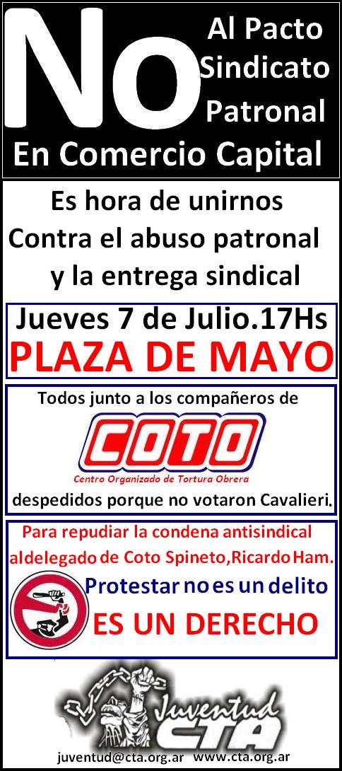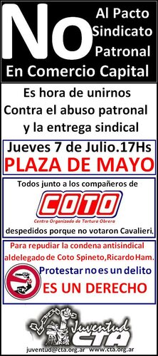 La criminalización de la protesta que denuncian los trabajadores tiene que ver con el reciente fallo que condenó a Ricardo Ham a un año y medio de prisión en suspenso por supuestas amenazas a Alfredo Coto entre otros directivos de la firma. Hecho que mereció el repudio de la CTA y la CGT.
